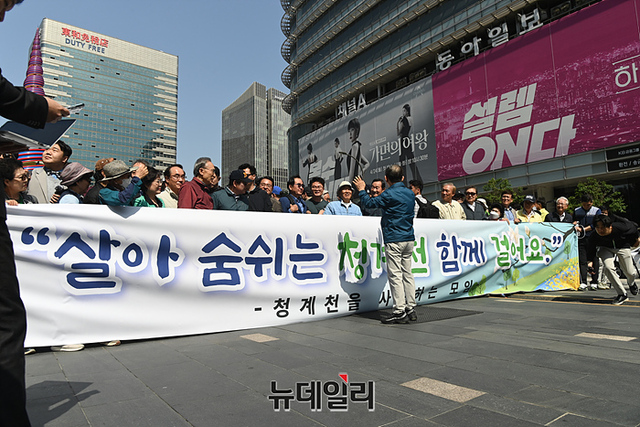 이명박 전 대통령이 15일 오전 서울 청계광장에서 열린 '청계천을 사랑하는 모임(청사모)' 주관의 걷기 행사에 참석하고 있다.