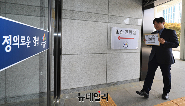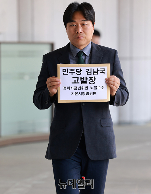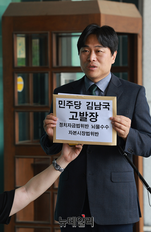 이종배 서울시의원이 15일 오전 서울 서초구 대검찰청 앞에서 불법 코인 투기 관련 김남국 국회의원을 정치자금법 위반, 뇌물수수, 자본시장법 위반 등의 혐의로 고발하며 입장을 밝히고 있다.
