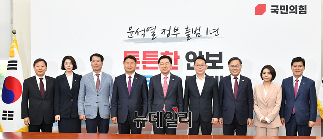김기현 국민의힘 대표가 15일 오전 국회에서 열린 최고위원 보궐선거 선거관리위원회 임명장 수여식에서 참석자들과 기념촬영하고 있다. (왼쪽부터 이철규 사무총장, 배현진, 양홍규, 노용호 선거관리위원, 김 대표, 김도읍 선거관리위원장, 홍석준, 함인경 선거관리위원, 구자근 당대표 비서실장)