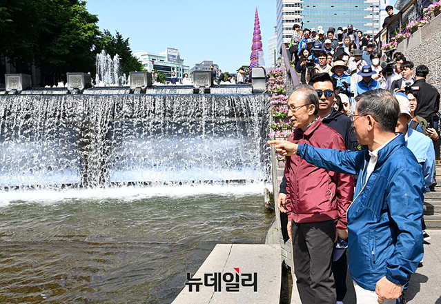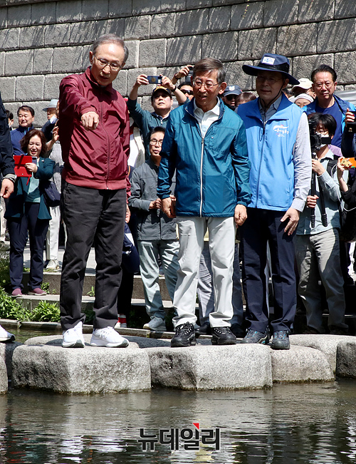 이명박 전 대통령이 15일 오전 서울 청계광장에서 열린 '청계천을 사랑하는 모임(청사모)' 주관의 청계천 걷기 행사에서 산책로를 따라 이동하고 있다.