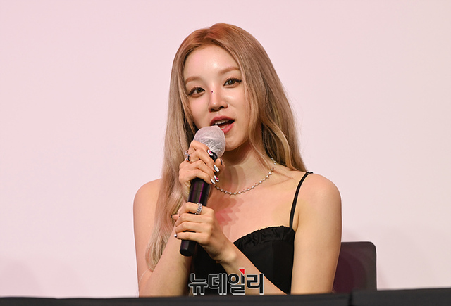 걸그룹 (여자)아이들((G)I-DLE)이 15일 오후 서울 강남구 조선팰리스에서 열린 여섯 번째 미니 앨범 'I feel' 제작발표회에서 앨범을 설명하고 있다.