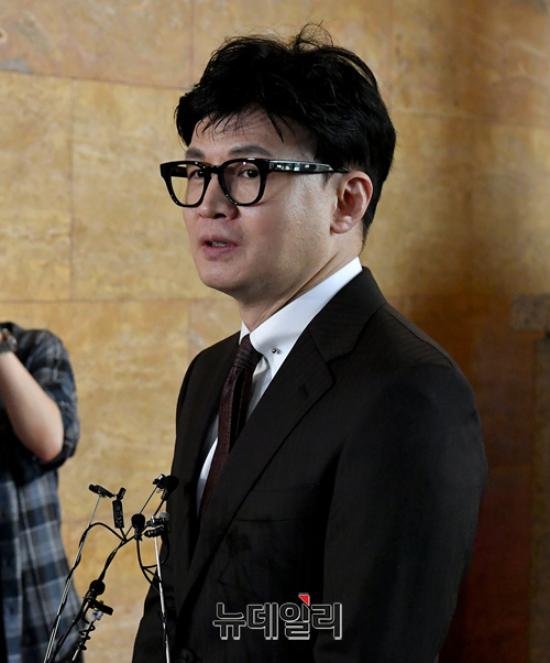 한동훈 법무부 장관이 16일 국회에서 열린 법제사법위원회 전체회의에 출석하던 중 취재진 질문에 답하고 있다.