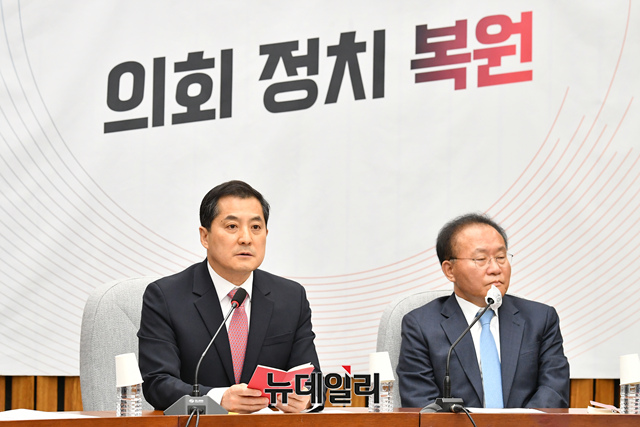 박대출 국민의힘 정책위의장이 16일 국회에서 열린 원내대책회의에 참석해 모두발언을 하고 있다.