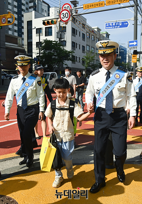 윤희근 경찰청장이 17일 오전 서울 구로구 덕의초등학교에서 진행한 '윤석열 정부 출범 1년 국정과제 현장 점검현장'에서 서울 최초로 설치된 '노란색 횡단보도'를 건너고 있다.