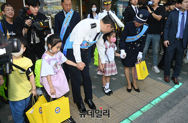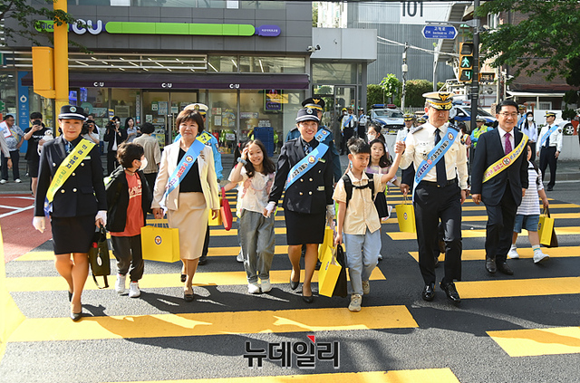 윤 청장은 이날 서울 최초로 '노란색 횡단보도'가 설치된 덕의초등학교를 찾아 안전 시설을 점검했다.
