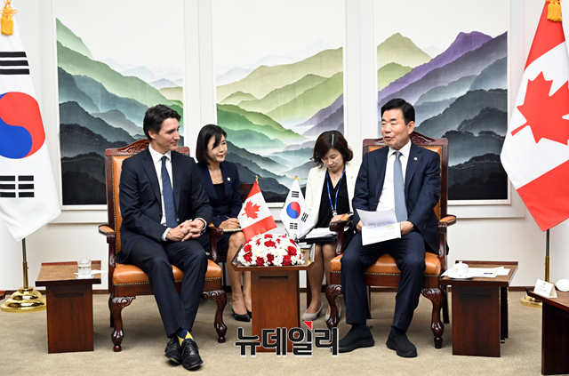 [포토] 인사 나누는 김진표 의장과 쥐스탱 트뤼도 캐나다 총리