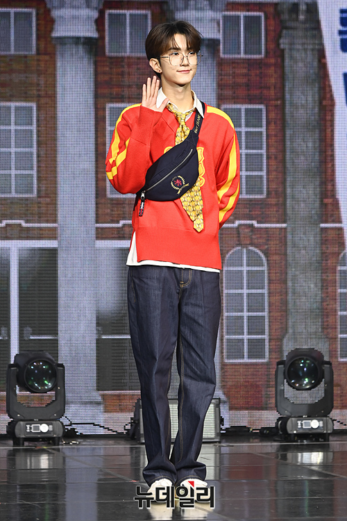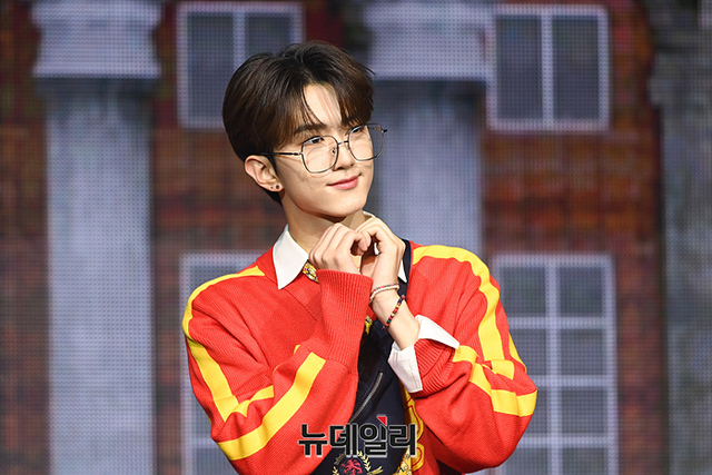그룹 유나이트(YOUNITE) 경문이 17일 오후 서울 마포구 서강대학교에서 열린 '빛 : BIT Part.1' 발매 기념 쇼케이스에서 포토타임을 갖고 있다.
