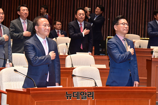 김기현 국민의힘 대표, 윤재옥 원내대표 등 소속 의원들이 17일 국회에서 열린 의원총회에서 국민의례를 하고 있다.