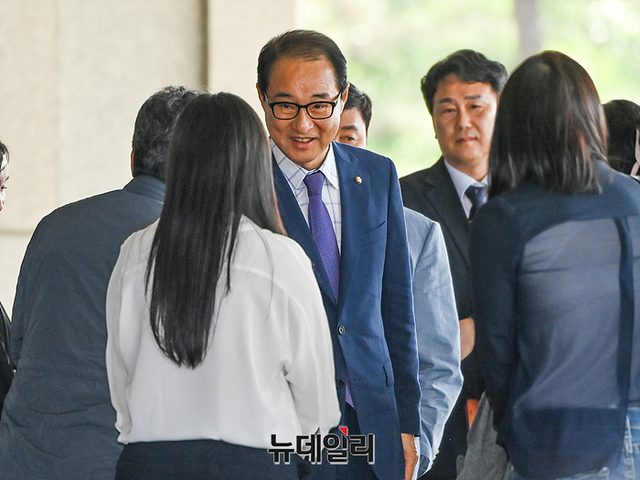 더불어민주당을 탈당한 이성만 의원이 19일 오전 민주당 전당대회 돈봉투 의혹과 관련해 피의자 신분으로 서울중앙지검으로 출석하며 지지자들과 인사를 나누고 있다.