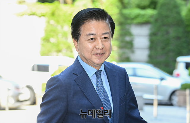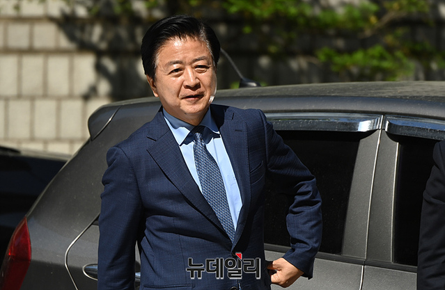 정치자금법 위반 혐의로 불구속 기소된 노웅래 더불어민주당 의원이 19일 오전 서울 서초구 중앙지법에서 열린 첫 공판에 출석하고 있다.