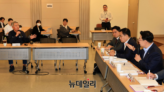 [포토] 장현국 위메이드 대표 브리핑 듣는 김성원 코인게이트 단장
