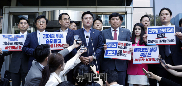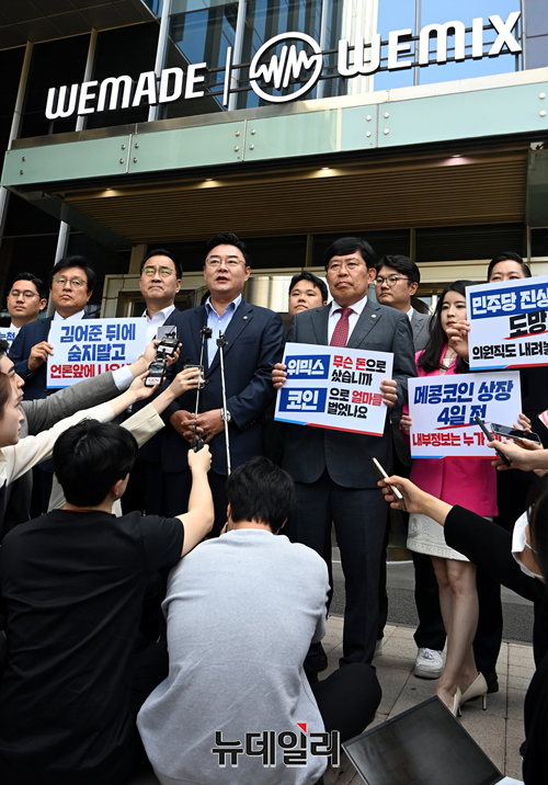 더불어민주당을 탈당한 김남국 의원의 '위믹스' 등 가상자산 보유 논란과 관련해 국민의힘 코인게이트 진상조사단이 19일 오전 경기 성남시 위메이드 본사를 방문해 기자회견을 하고 있다.