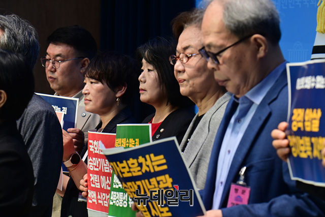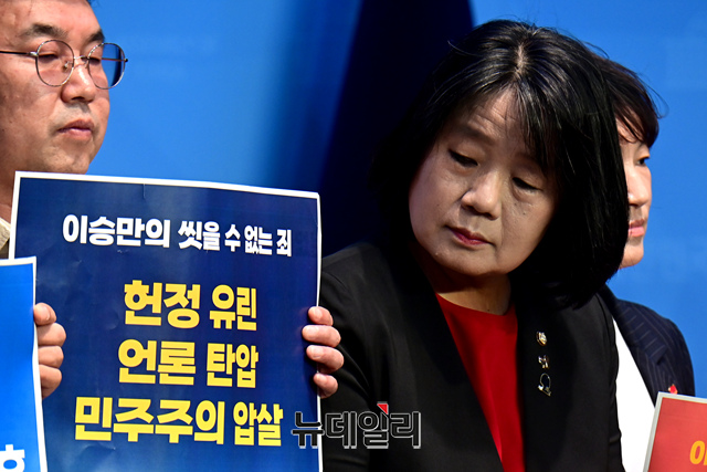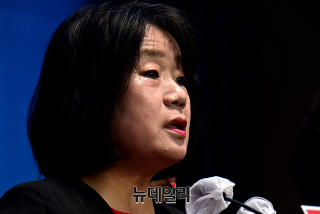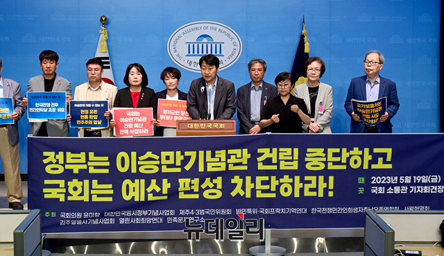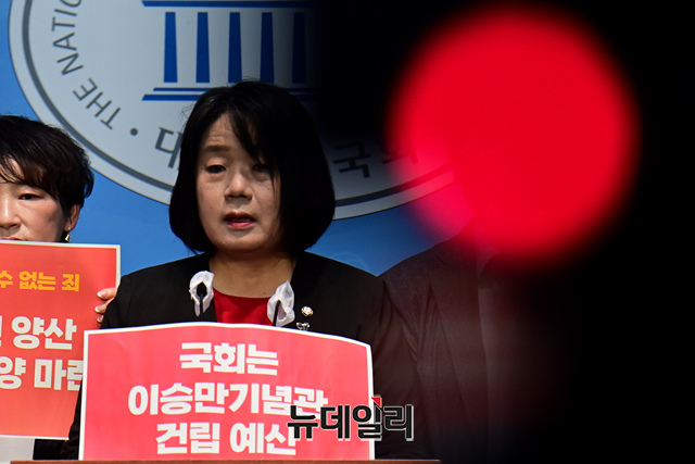 윤미향 무소속 의원이 19일 오전 국회 소통관에서 이승만기념관 건립 시도 및 예산편성 중단 촉구 기자회견을 하고 있다.