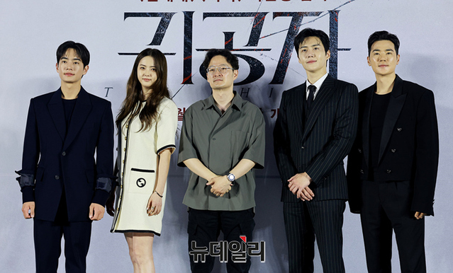 배우 강태주(왼쪽부터), 고아라, 박훈정 감독, 김선호, 김강우가 22일 오전 서울 광진구 롯데시네마 건대입구에서 열린 영화 '귀공자(연출 박훈정)' 제작발표회에서 포토타임을 갖고 있다.