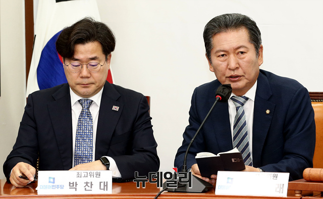 정청래 더불어민주당 최고위원이 19일 국회에서 열린 최고위원회의에서 모두발언을 하고 있다.