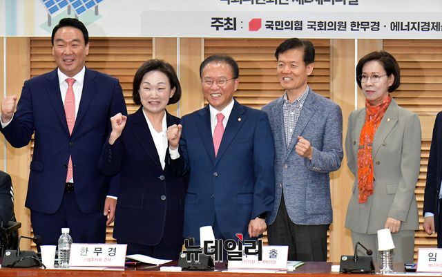 윤재옥 국민의힘 원내대표와 한무경 의원이 23일 오전 국회 의원회관에서 열린 '에너지 수요 분산 정책 필요성과 과제 토론회'에서 기념촬영을 하고 있다.