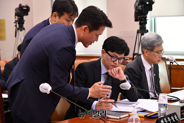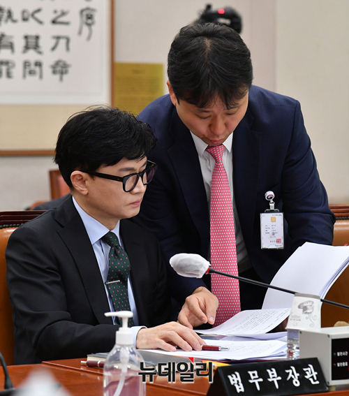 [포토] 보좌진과 대화 나누는 한동훈 법무부 장관