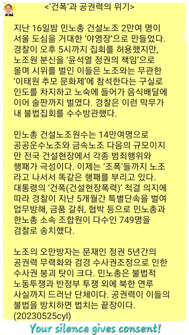 ■ ’건폭’과 공권력의 위기 ■지난 16일밤 민노총 건설노조 2만여 명이 서울 도심을 거대한 ‘야영장’으로 만들었다.