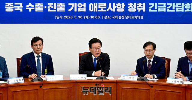 이재명 더불어민주당 대표가 30일 오전 국회에서 열린 중국 수출·진출 기업 애로사항 청취 긴급간담회에서 모두발언을 하고 있다.