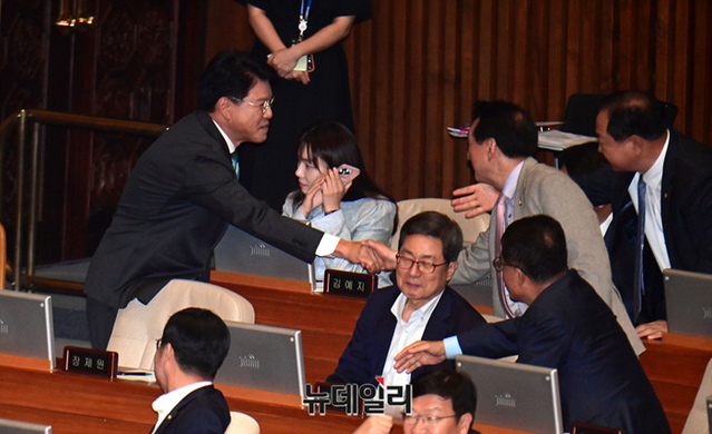 장제원 국민의힘 의원이 30일 국회에서 열린 본회의에서 과학기술정보방송통신위원장 당선인사를 마치고 동료 의원들의 축하를 받고 있다.