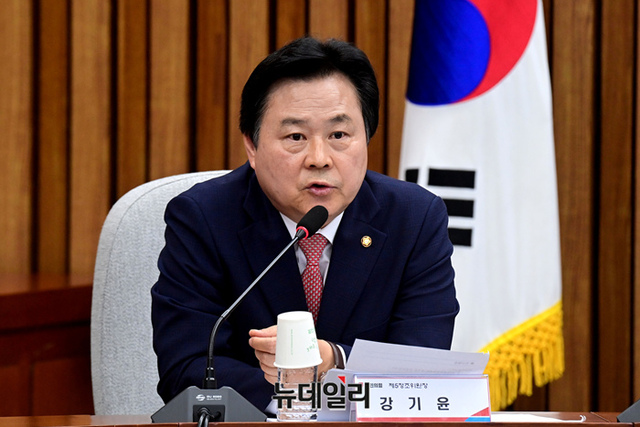 강기윤 국민의힘 제5정조위원장이 31일 국회에서 열린 응급의료 긴급대책 당·정협의회에 참석해 모두발언을 하고 있다.