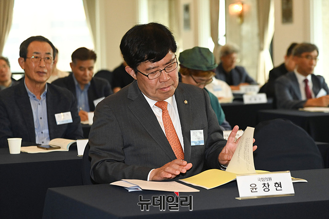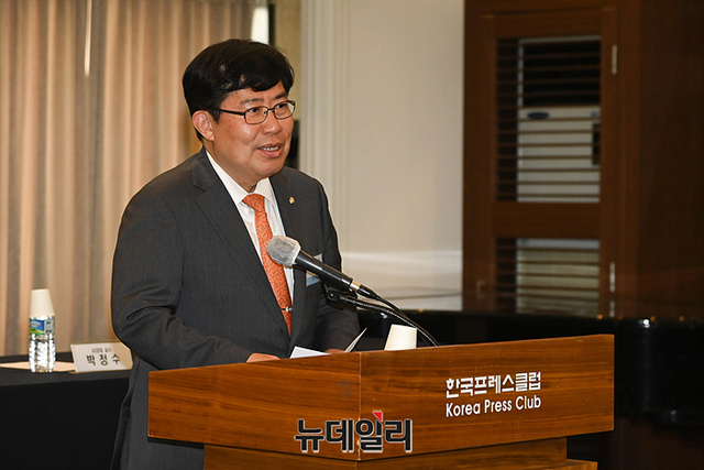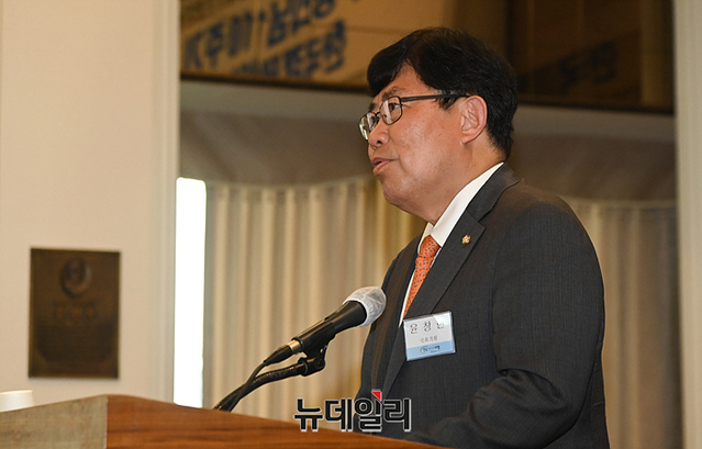 윤창현 국민의힘 의원이 31일 오후 서울 중구 한국프레스센터에서 열린 월례토론회에서 축사를 하고 있다.