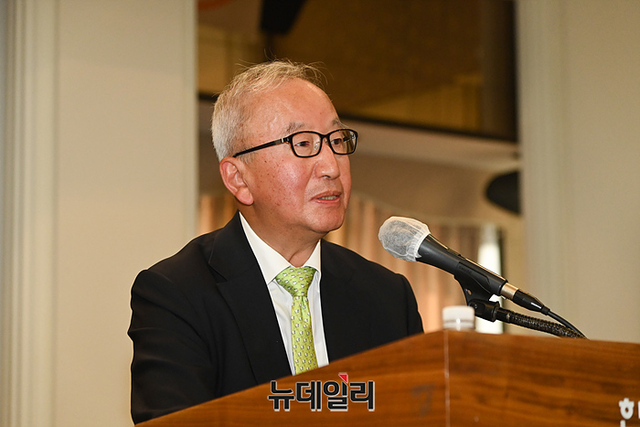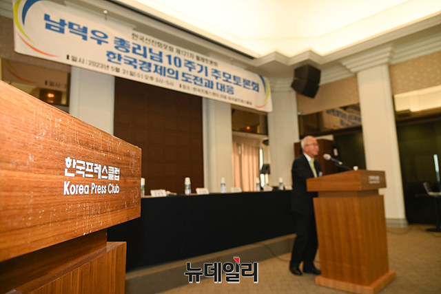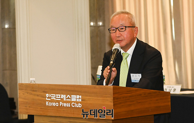 현오석 전 부총리가 31일 오후 서울 중구 한국프레스센터에서 열린 월례토론회에서 기조강연을 하고 있다.