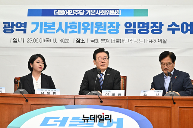 이재명 더불어민주당 대표가 1일 오후 국회에서 열린 '광역 기본사회위원장 임명장 수여식'에서 모두발언을 하고 있다.