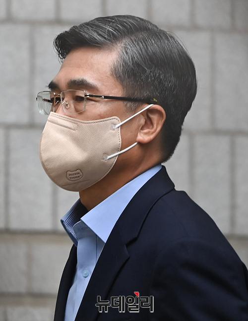 서해 공무원 피격 사건을 은폐하려 한 혐의로 기소된 서욱 전 국방부 장관이 2일 오전 서울 서초구 중앙지방법원에서 열린 공판에 출석하고 있다.