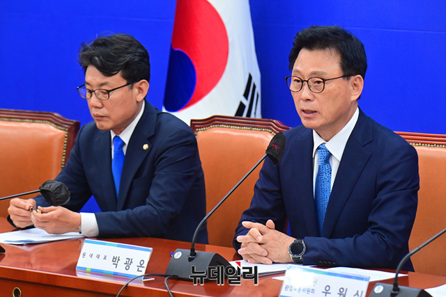박광온 더불어민주당 원내대표가 2일 오전 국회에서 열린 건설노동자 탄압 TF 1차 전체회의에서 인사말을 하고 있다.