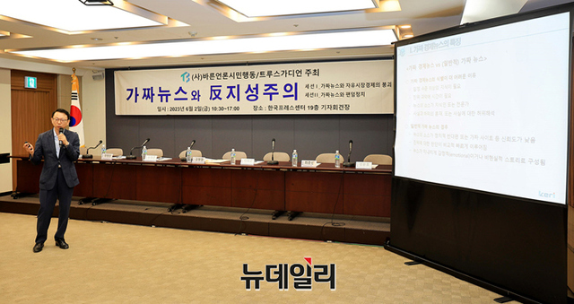 이태규 한국경제연구원 선임연구위원이 2일 오전 서울 중구 한국프레스센터에서 '가짜뉴스와 反지성주의' 주제로 열린 바른언론시민행동 2차 심포지엄에서 발제하고 있다.