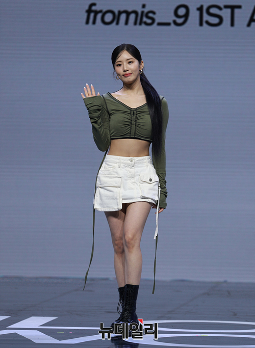 프로미스나인 박지원이 5일 오후 서울 광진구 예스24라이브홀에서 열린 정규 1집 'Unlock My World(언락 마이 월드)' 쇼케이스에서 포토타임을 갖고 있다.