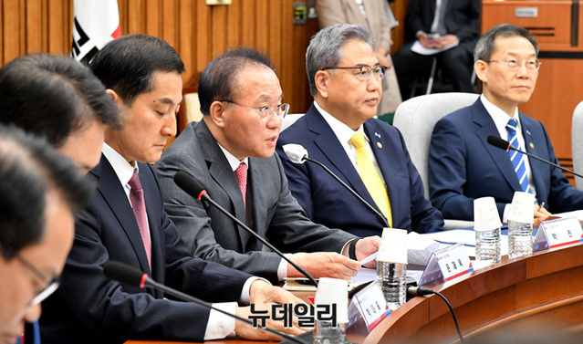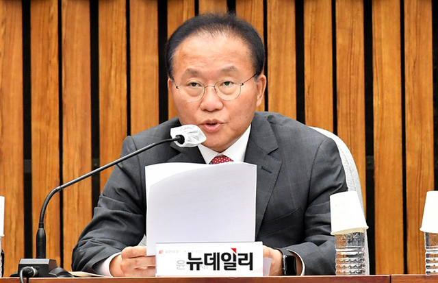 윤재옥 국민의힘 원내대표가 7일 오전 국회에서 열린 '우리바다 지키기 검증 TF 확대회의'에 참석해 모두발언을 하고 있다.