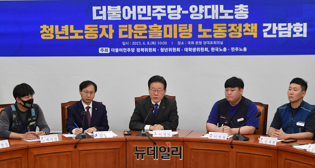 이재명 더불어민주당 대표가 8일 국회에서 열린 '더불어민주당-양대노총 청년노동자 타운홀미팅 노동정책간담회'에서 모두발언을 하고 있다.