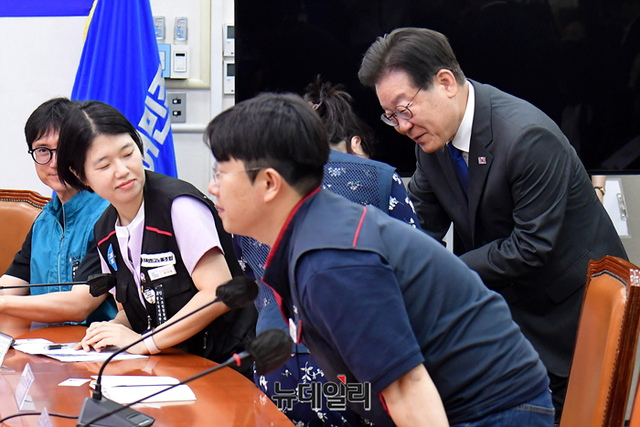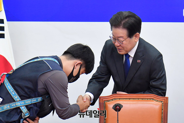 이재명 더불어민주당 대표가 8일 국회에서 열린 '더불어민주당-양대노총 청년노동자 타운홀미팅 노동정책간담회'에서 참석자들과 악수를 나누고 있다.