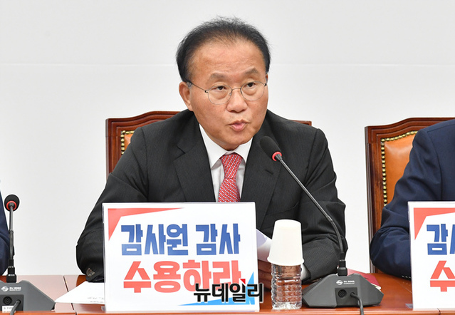 윤재옥 국민의힘 원내대표가 9일 오전 국회에서 열린 원내대책회의에서 모두발언을 하고 있다.