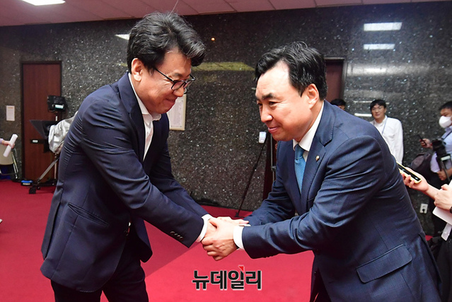 체포동의안 표결을 앞두고 있는 윤관석 무소속 의원이 12일 오전 국회에서 열리는 더불어민주당 의원총회 회의장 앞을 찾아 의원들과 인사를 나누고 있다.