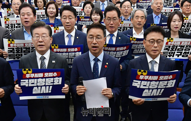이재명 더불어민주당 대표 및 소속의원들이 12일 국회에서 열린 의원총회에서 '후쿠시마 오염수 국민청문회 실시!' 등의 피켓을 들고 구호를 외치고 있다.