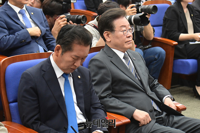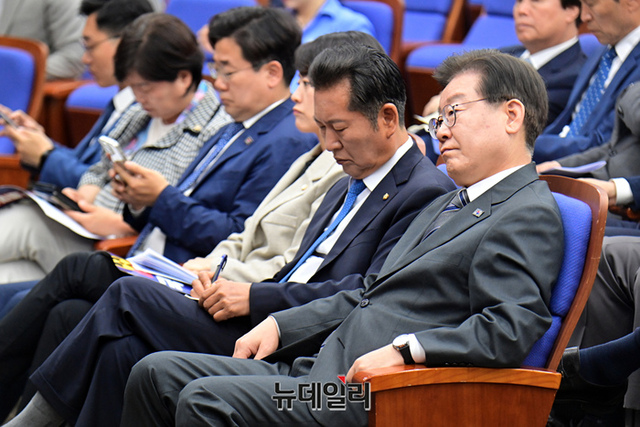 이재명 더불어민주당 대표가 12일 오전 국회에서 열린 의원총회에 참석해 자리에 앉아 있다.
