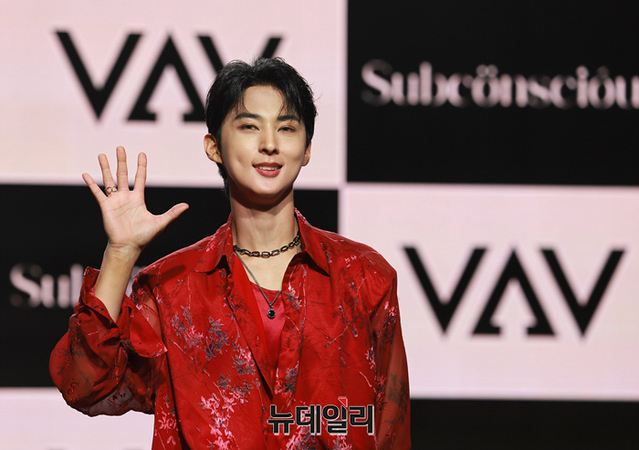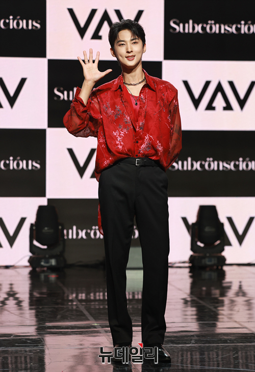 아이돌그룹 VAV(브이에이브이) 에이스가 12일 오후 서울 강남구 일지아트홀에서 열린 미니 7집 서브칸셔스 쇼케이스에서 포토타임을 갖고 있다.