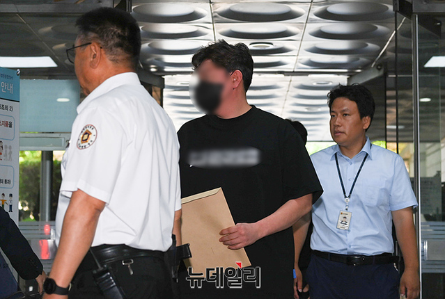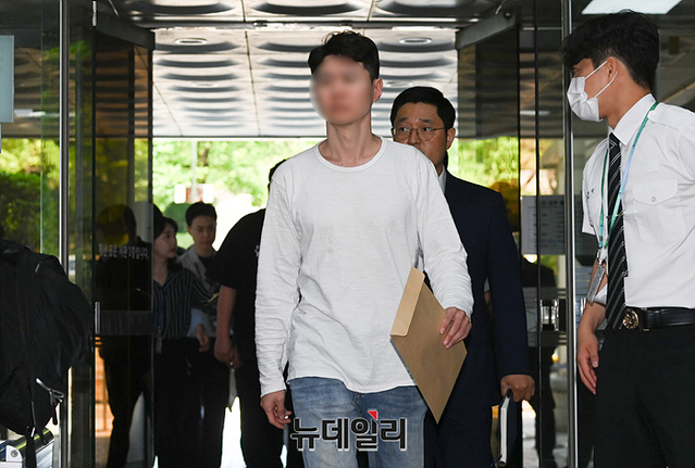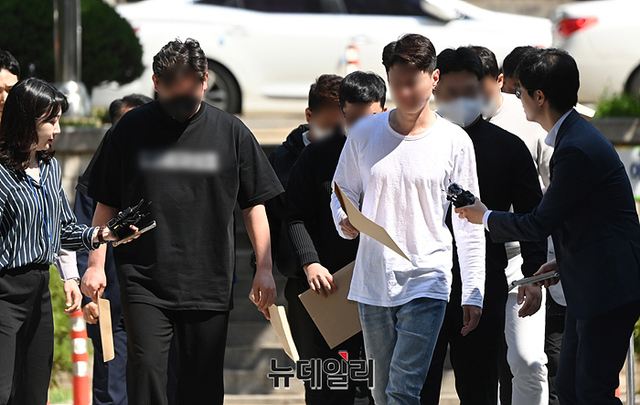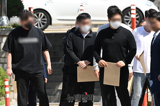 2020년 서울 그랜드하얏트 호텔에서 난동을 부린 폭력조직 '수노아파' 조직원 7명이 13일 오전 서울 서초구 중앙지법에서 열린 영장실질심사에 출석하고 있다.