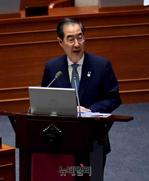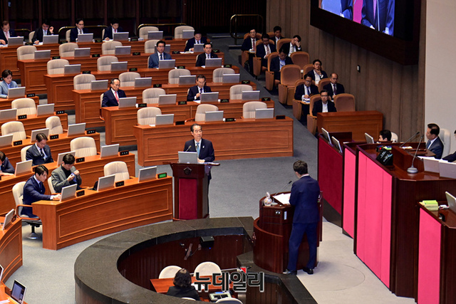 한덕수 국무총리가 13일 오후 국회에서 열린 본회의 경제분야 대정부질문에서 의원들의 질문에 답하고 있다.