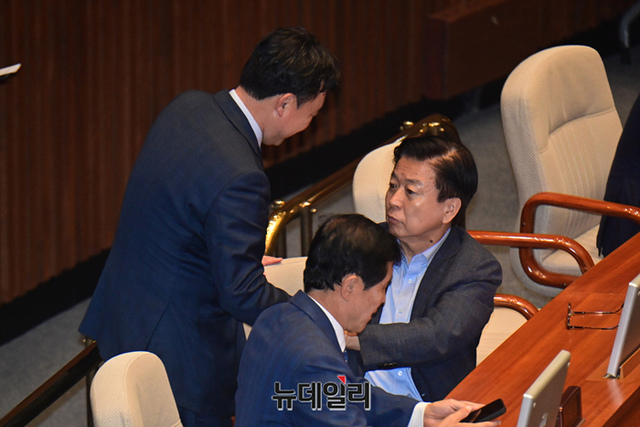 윤관석 무소속 의원이 13일 오후 국회에서 열린 본회의에 참석해 더불어민주당 의원들에게 인사를 하고 있다.