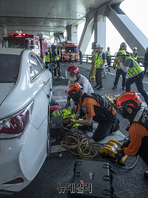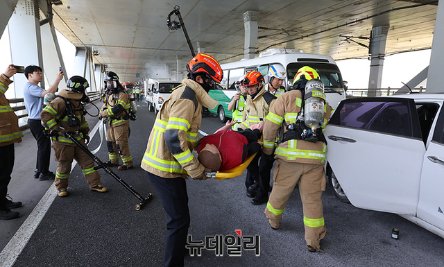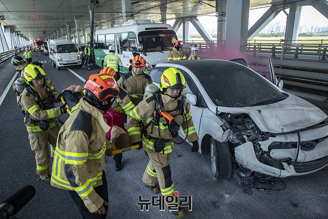 안개속 50중 추돌사고 상황을 가정해 급파된 소방대원들이 13일 오후 인천 중구 신공항하이웨이 영종방면 영종대교 하부에서 열린 재난대응 안전한국훈련(SKX : Safe Korea Exercise)에서 부상자를 대피시키고 있다.재난대응 안전한국훈련(SKX : Safe Korea Exercise)은 다양한 유형의 재난에 대비한 관계기관 합동, 민간참여 훈련 실시, 정부와 민간의 역량을 강화하고 재난 시 신속히 대응하기 위 목적으로 행정안전부가 주관하는 훈련이다. (사진=공동취재단)