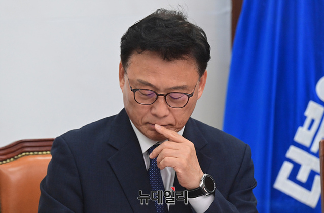 박광온 더불어민주당 원내대표가 14일 오전 국회에서 열린 최고위원회의에서 생각에 잠겨 있다.
