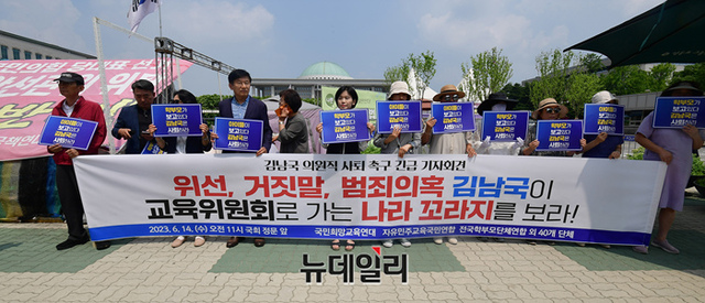 국민희망교육연대·자유민주교육국민연합·전국학무보단체연합 등이 14일 오전 국회 앞에서 김남국 의원직 사퇴 촉구 긴급 기자회견을 하고 있다.