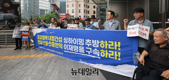 반중시민단체 CCP(중국공산당)아웃과 공자학원실체알리기운동본부가 14일 오후 서울 중구 주한중국대사관 인근에서 싱하이밍 중국대사 추방과 이재명 민주당 대표를 규탄하는 기자회견을 갖고 있다.