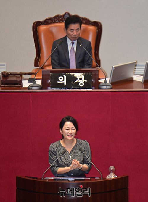 산업통상자원중소벤처기업위원장에 선출된 이재정 더불어민주당 의원이 14일 오후 국회에서 열린 본회의 교육·사회·문화 대정부질문에서 당선인사를 하고 있다.