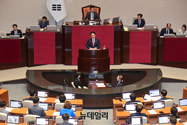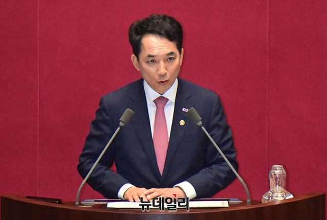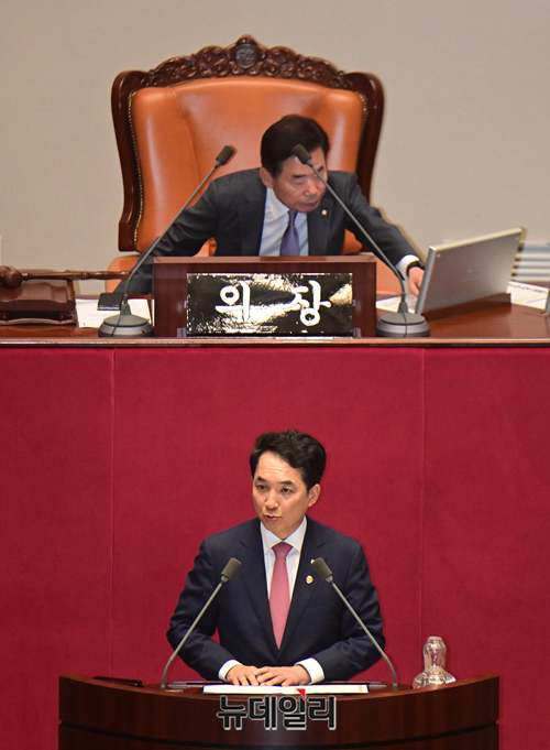박민식 국가보훈부 장관이 14일 오후 국회에서 열린 본회의 교육·사회·문화 분야 대정부질문에서 신임 국무위원 인사를 하고 있다.