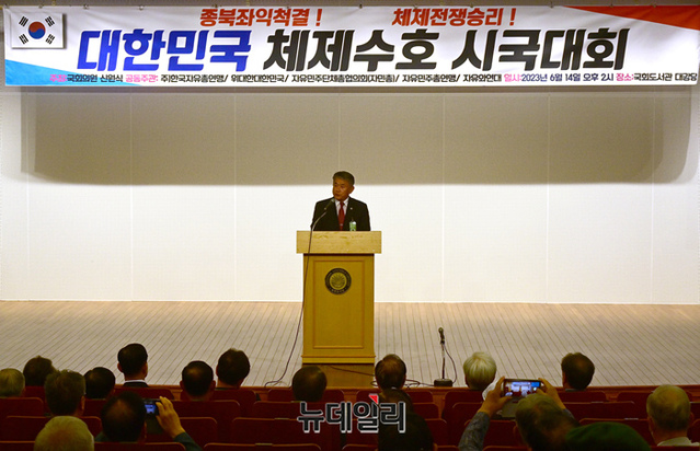 강신길 자유와연대 대표공동운영위원장이 14일 오후 국회 도서관 대강당에서 '대한민국 체제수호 시국대회'에서 개회사를 하고 있다.
